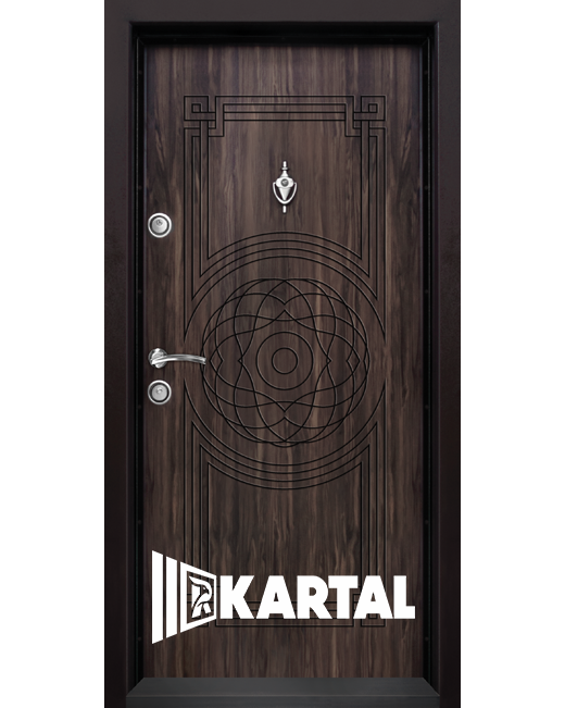 Входна блиндирана врата, изработена от 1.2 мм прахово боядисан метал и 10 мм MDF фрезован панел с ламинирано покритие.
